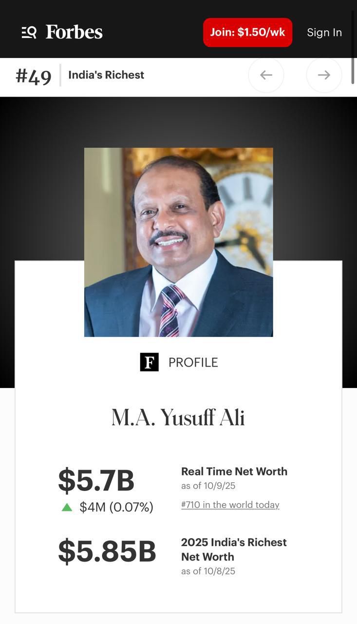 51937 കോടി രൂപയുടെ (5.85 ബില്യൺ ഡോളർ) ആസ്തിയോടെയാണ് വ്യക്തി​ഗത മലയാളി സമ്പന്നരിൽ യൂസഫലി ഒന്നാമതെത്തിയത് ; മുത്തൂറ്റ് ഫാമിലിയാണ് ഏറ്റവും സമ്പന്ന കുടുംബം