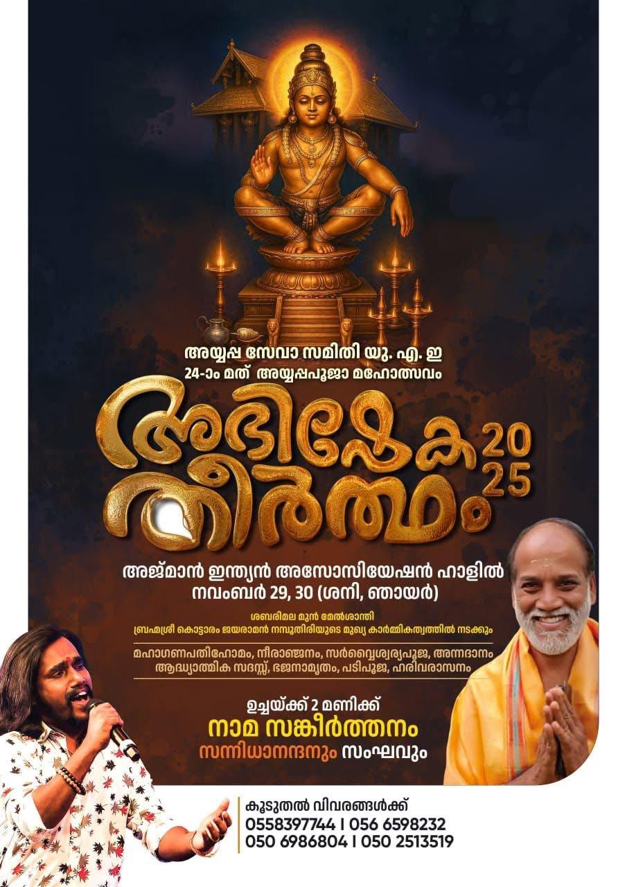 യുഎഇ അയ്യപ്പസേവ സമിതിയുടെ ”അയ്യപ്പ പൂജ മഹോത്സവം” നവംബർ 29, 30 തിയ്യതികളിൽ അജ്മാനിൽ