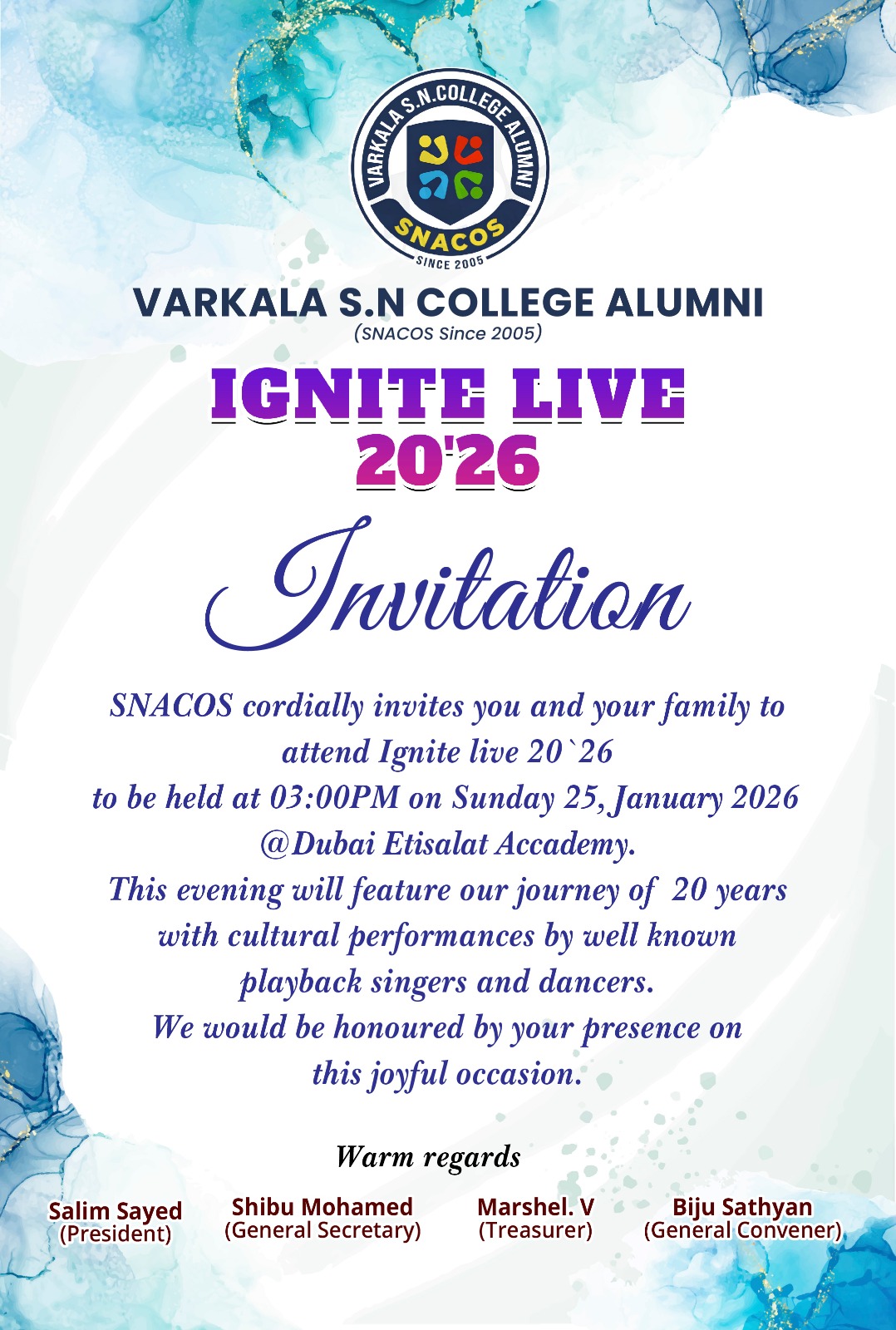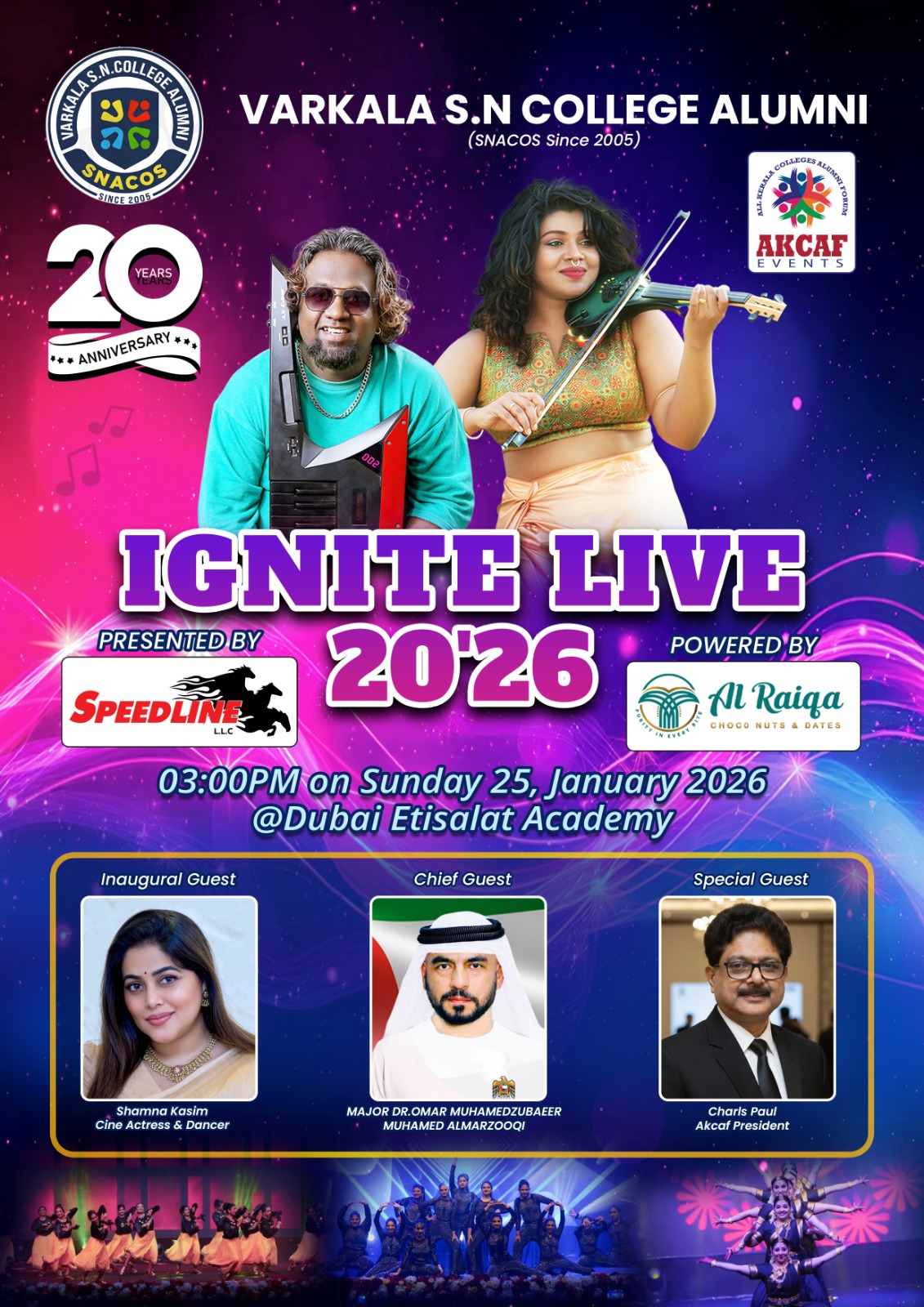 ദുബായ്: യുഎഇയിലെ വർക്കല എസ്.എൻ. കോളേജ് പൂർവ്വ വിദ്യാർത്ഥി സംഘടനയായ ‘സ്നാക്കോസ്’ (SNACOS) തങ്ങളുടെ പ്രവർത്തനത്തിന്റെ ഇരുപതാം വാർഷികം ‘ഇഗ്നൈറ്റ് ലൈവ് 20’26’ (Ignite Live 20’26) എന്ന പേരിൽ വിപുലമായി ആഘോഷിക്കുന്നു. 2026 ജനുവരി 25 ഞായറാഴ്ച വൈകുന്നേരം 3:00 മണി മുതൽ ദുബായ് എത്തിസലാത്ത് അക്കാദമിയിൽ വെച്ചാണ് ചടങ്ങുകൾ നടക്കുന്നത്.