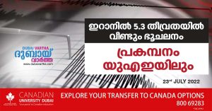 തെക്കൻ ഇറാനിൽ 5.3 തീവ്രത രേഖപ്പെടുത്തിയ ഭൂചലനമാണ് യുഎഇയിലെ പ്രകമ്പനത്തിന് കാരണമെന്ന് ദേശീയ കാലാവസ്ഥാ കേന്ദ്രം സ്ഥിരീകരിച്ചു. എന്നിരുന്നാലും, ഭൂചലനം യുഎഇയെ ബാധിച്ചിട്ടില്ലെന്ന് നാഷണൽ സെന്റർ ഓഫ് മെറ്റീരിയോളജി ട്വീറ്റ് ചെയ്തു. രാത്രി 8.07ന് 10 കിലോമീറ്റർ താഴ്ചയിലാണ് ഭൂചലനം ഉണ്ടായത്.